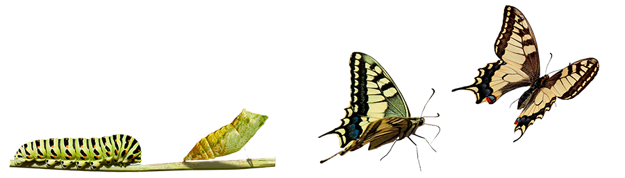 La creencia popular de que los fluidos corporales dentro de la pupa se descomponen en una «sopa» y luego se reforman en la forma de una mariposa es en gran parte falsa. El cambio de larva a mariposa adulta es en realidad un proceso muy gradual. Los grupos de células madre a partir de las cuales se desarrollan las alas están presentes en los segmentos 2 y 3 de las larvas pequeñas. Se replican y se diversifican durante el desarrollo de las larvas. En los últimos días antes de la pupación, el desarrollo se acelera, por lo que las alas están casi completamente formadas en el momento de la pupación. Lo mismo se aplica a las antenas, ojos y palpos, todos los cuales son visibles en la pupa recién formada. Ciclo