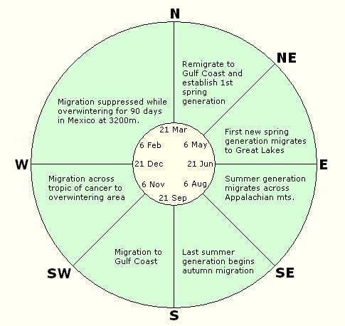 Los insectos no «saben» dónde están, por lo que no pueden navegar por puntos de referencia. Navegan principalmente mediante el uso de una brújula interna en combinación con un reloj circadiano que determina el momento de las migraciones. La migración de Monarcas se desplaza hacia la derecha a una tasa de 1 grado por día para todas las generaciones del ciclo migratorio anual. La migración hacia el norte desde el sitio de hibernación en México se desencadena por el equinoccio de primavera. Las rutas y velocidades de migración están influenciadas por los vientos y las condiciones climáticas.